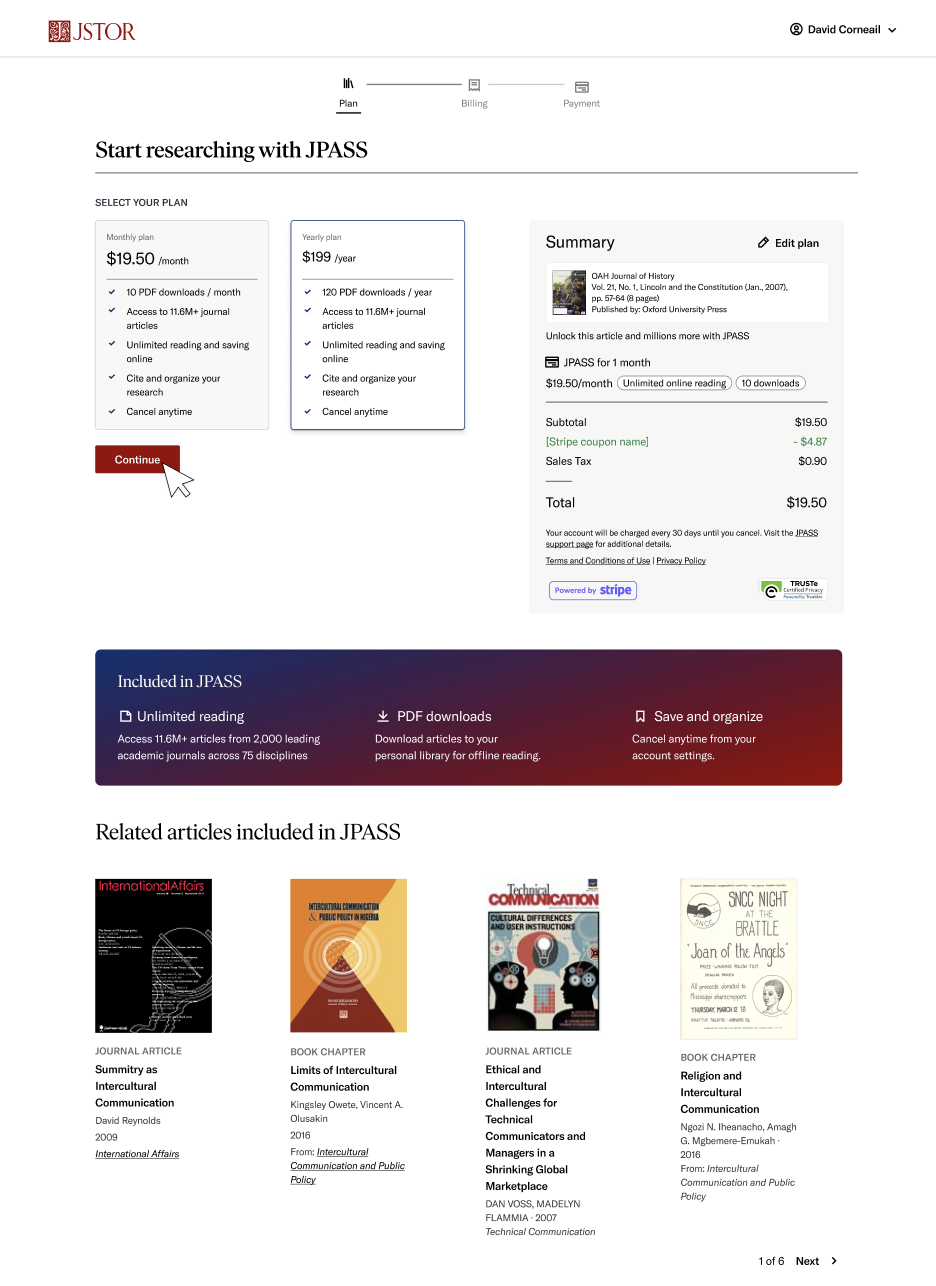 The individual access program for JSTOR is called JPASS. The program generates roughly around 1 million in annual revenue. The program is incredibly important for the mission of JSTOR. Provide access to researchers all around the world.